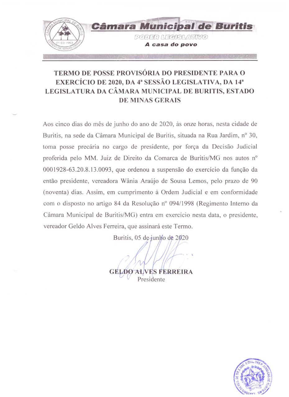 termo de Posse Provisória do Presidente para o exercício de 2020